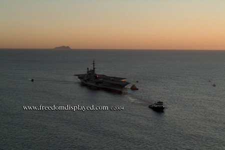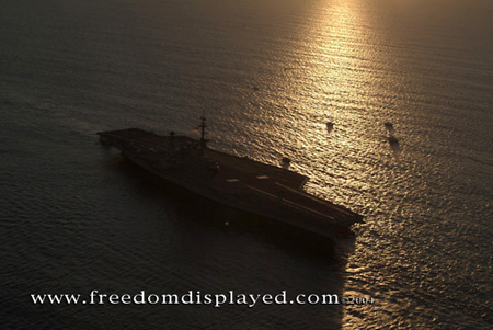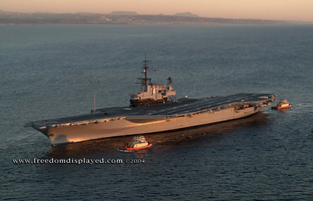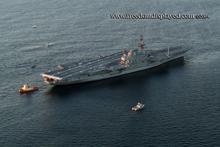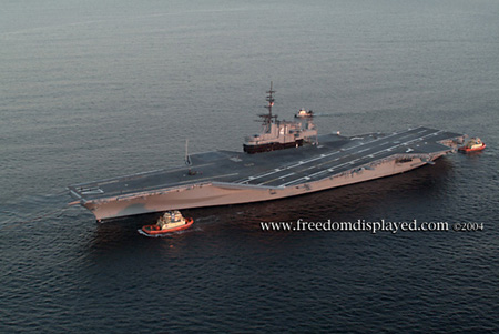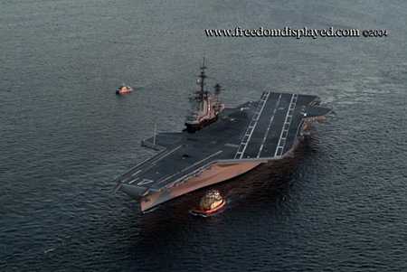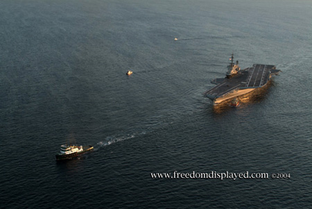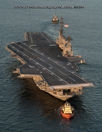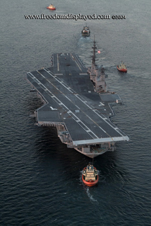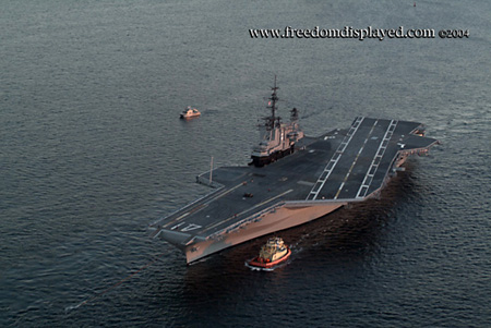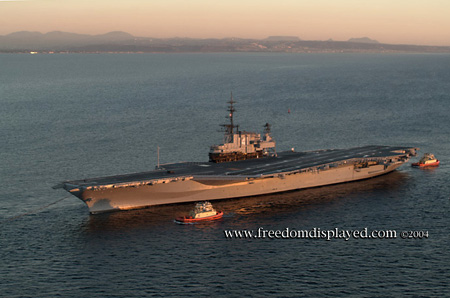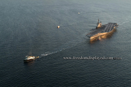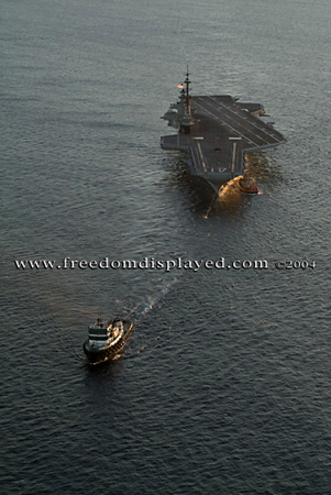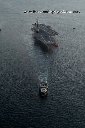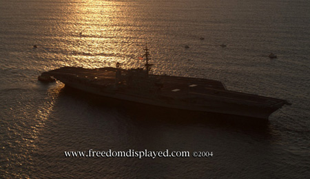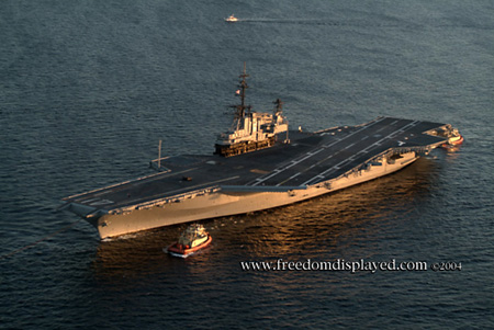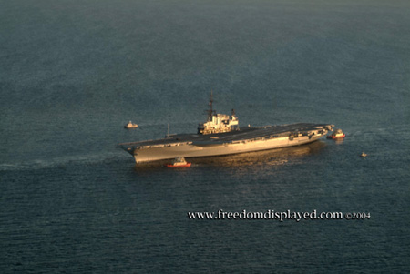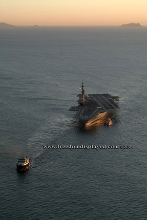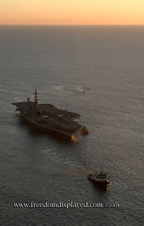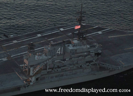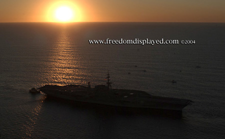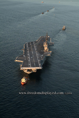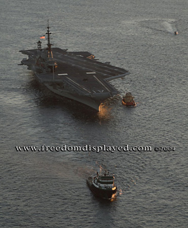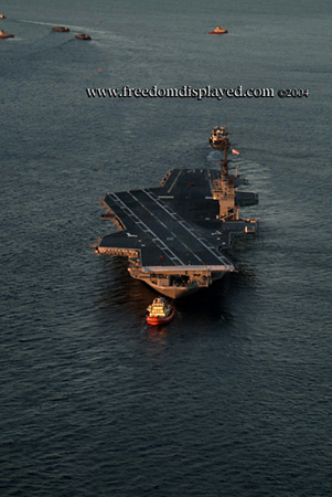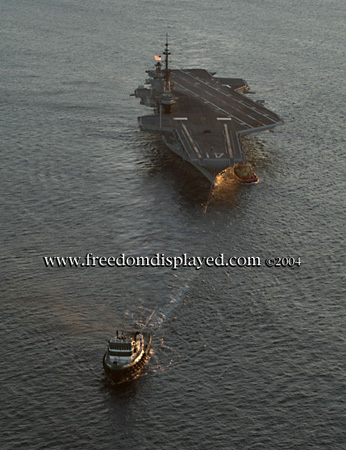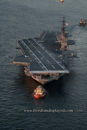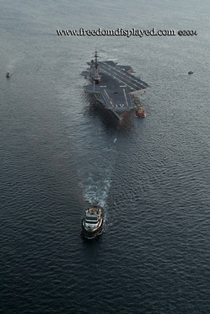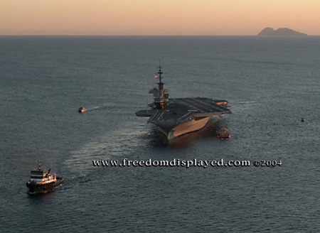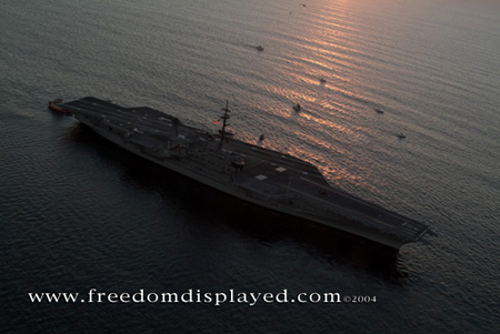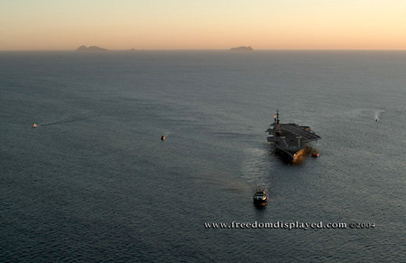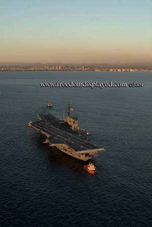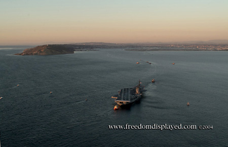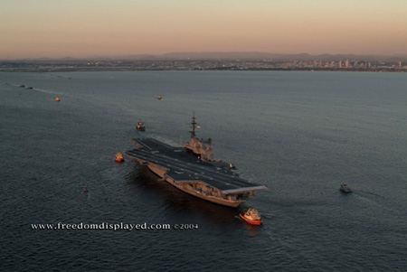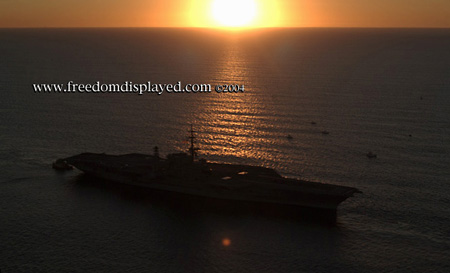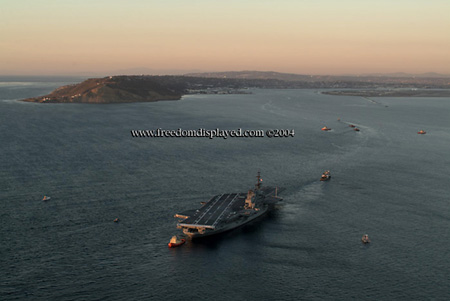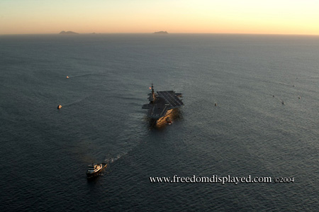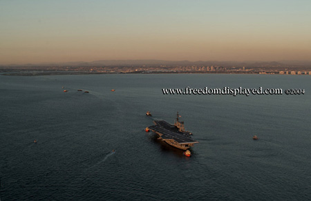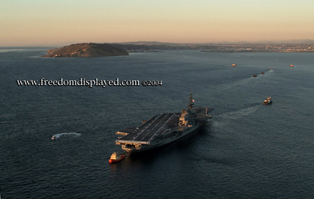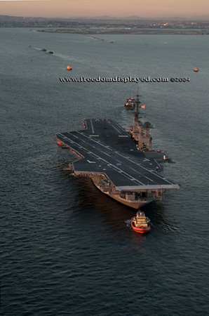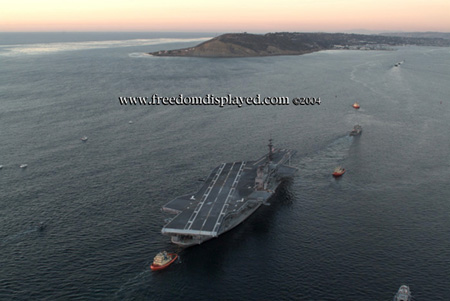 These photos were taken by Gene in a helicopter he rented for photographing the arrival of Midway in San Diego on January 05, 2004. The "freedomdisplayed.com" brand on these photos is his old company's name.