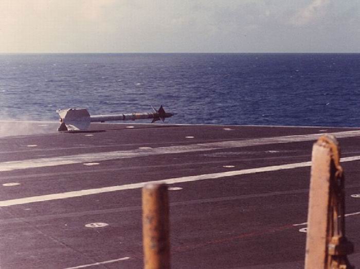 An AIM-9M Sidewinder air-to-air missile sliding along the deck
