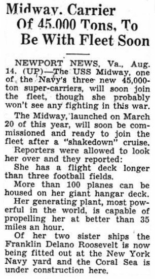 August 14, 1945 UPI article about Midway.