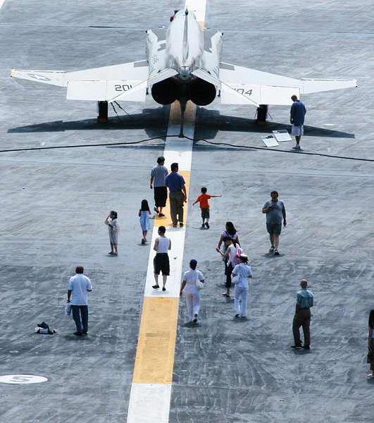 they get to ride up the ship's starboard side aircraft elevator. In the